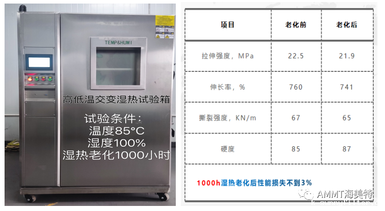 物理性能优异,拉伸强度>25Mpa、伸长率>1000%,撕裂强度>60KN/m,