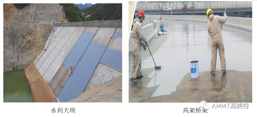 施工的简单化、优异的材料性能、超长的使用寿命和良好的附着力,使其可附于金属、混凝土、砖石、石棉水泥板、木材、沥青等各种基材,可以应用于阳台、卫生间、游泳池等领域的装饰防水一体化工程,也可应用于大坝、桥梁、污水处理设施等混凝土表面的防护!