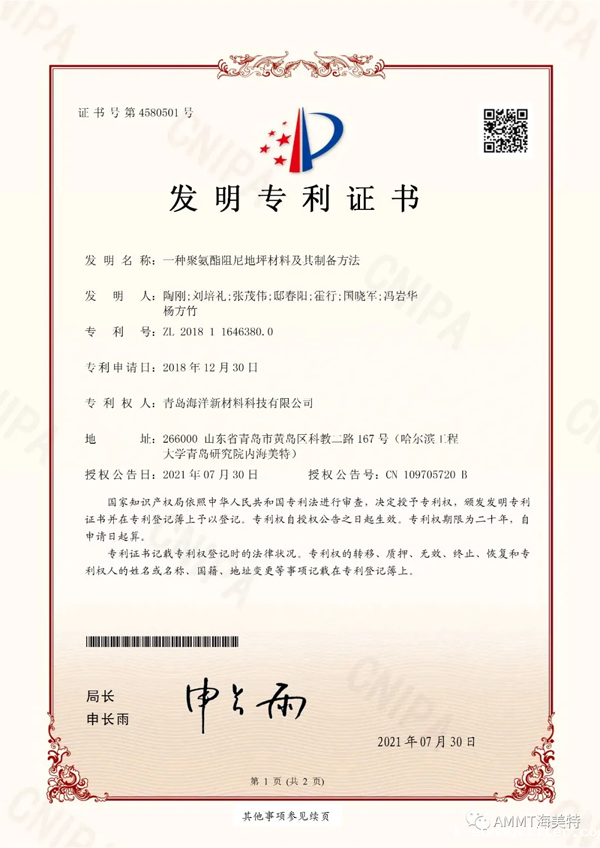 2021年7月30日,YO米直播NBA最新消息申请的《一种聚氨酯阻尼地坪材料及其制备方法》发明专利获得国家知识产权局授权,授权专利号:ZL 2018 1 1646380.0。目前,公司共获得国家授权专利33项,其中发明专利31项,实用新型专利1项,外观设计专利1项。