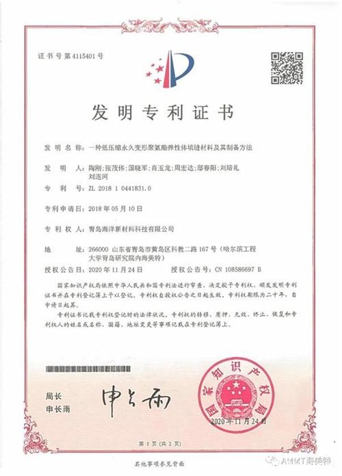 2020年11月24日,YO米直播NBA最新消息申请的《一种低压缩永久变形聚氨酯弹性体填缝材料及其制备方法》发明专利获得国家知识产权局授权。目前,公司共获得国家授权专利32项,其中发明专利29项,实用新型专利2项,外观设计专利1项。